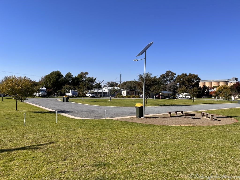 The camp kitchen is fully enclosed so we cook dinner on the BBQ and dine in the warmth. Dinner is crumbed steak steamed verges, mash, and gravy. Once more we review our plans and delete poor old Temora as it is too close. Sixty kilometres is a bit of a short day.