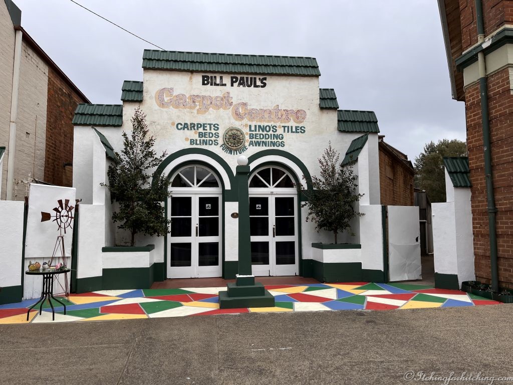 We take the Mid Western Highway up towards Cowra. This is all sheep farms and golden poplars line the road. Cowra is too busy for us to even consider looking for parking spaces, so we push on then, whoops we miss the turnoff to the B81 and the GPS sends us down a closed street. Extricating ourselves we push on to Canowindra (pronounced Ca noun dra). Little lambs are up to their bellies in green grass. We pull up for a walk around the town and notice that the caravan picnic table is down (and was probably flapping) …and none of us noticed! Walking the dogs along the historic Main Street it’s noticeable that this is a popular town. There are some tempting shops and one of the hotels is undergoing a facelift.