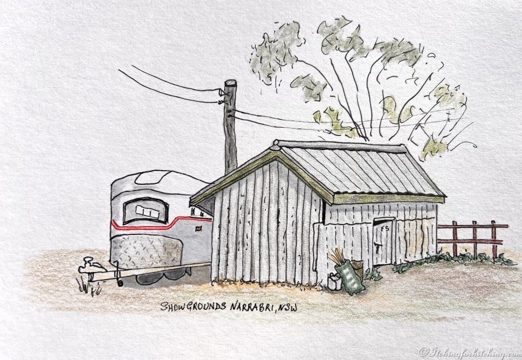 We farewell Vee who is off to Bingara. Woody walks into town. We girls drive to the shops as VeeWee needs a prescription filled. After a long wait, she must return to the park to get proof of ID. In the meantime, Elle and I find a rather inviting coffee shop called Yield and settle in for a while. An obviously local woman stops Elle in the street and asks if perhaps she doesn’t feel the cold seeing that she is in a sleeveless top. Crikey, and we think it’s warm. Woody returns to camp with a bag of apples for the horses. I sketch the stable yards and we read while watching the comings and goings of the campground.