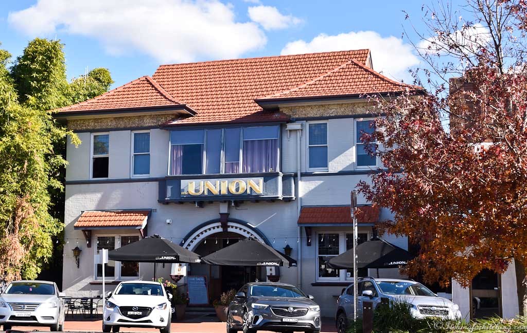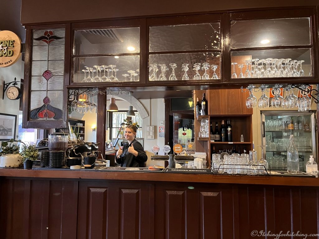 Woody walks around town while we girls take the car on a tour. Once again, we’ve forgotten that a) it’s Saturday and b) it’s a country town and people have better things to do than open their shops when the only people around are 3 old ducks snapping photos. Thus, shopping is out but admiring the beautiful buildings and kicking up autumn leaves is definitely in. We stumble upon a welcoming bar/cafe (The Union) with a cheery young woman in charge. She boasts that her barista skills are tops and she is right. It’s pleasant sitting outside in the warm sun with bubbles, because that’s what warm days are meant for.