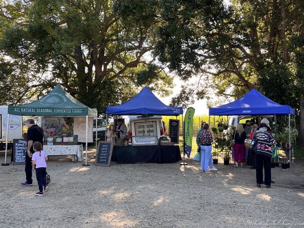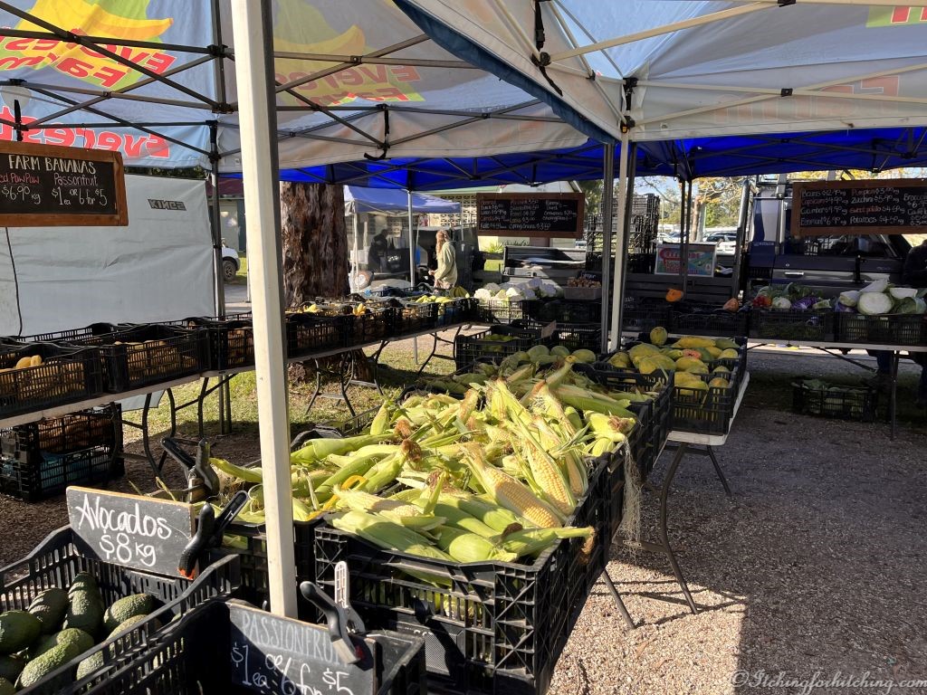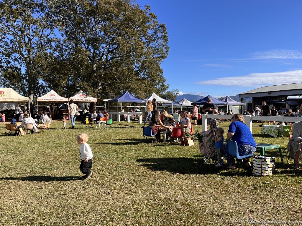 A bright sunny and warm morning and the local farmers market ‘Murbah’ has set up at the far end of the Showgrounds. We return with bananas, passionfruit, capsicum relish, and felafels. Wandering the stalls is enjoyable, people are breakfasting on the lawns and the crowd is colourful, from trendy to hippie. The produce is farm fresh and the backdrop is acres of green sugar cane and the deep blue of the Mt Warning range.