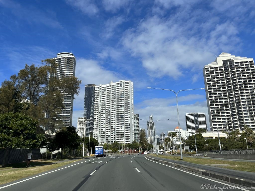 VeeWee drives up to Southport to deliver her brother’s horse racing trophies that have been filling her motor home for weeks. We drop Elle off at her friend’s high rise in Paradise Waters and we meet Woody’s brother, Woody the Elder, and our sister-in-law, the Very Good Golfer for lunch at Chong & Co Thai at Pacific Fair. I’m quite sure this city gets taller every time we visit. I pick up a couple of pairs of jeans while I have the chance and, on our way back, Elle buys new summer weight bedding for the motor home. While Woody makes a difficult decision. Our Techni Ice ice box that has served us so well for 8 years is a bit too large for the back of the Touareg, so he buys a Brass Monkey 12/240 volt fridge freezer.