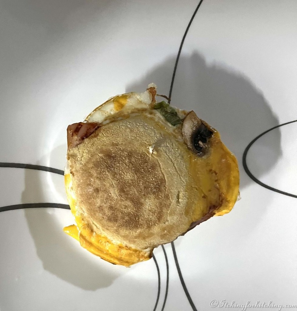 Dinner tonight is light, but we do want to try cooking eggs in the pie maker. We both have different ideas about what would work so we each do our own thing. Woody puts in an English muffin filled with ham, spring onion, mushroom, cheese, and egg. I toast my muffin and cook egg, ham, and cheese in the pie maker. Both are delicious but Woody won hands down. Yep, the pie maker is a great way to cook eggs.