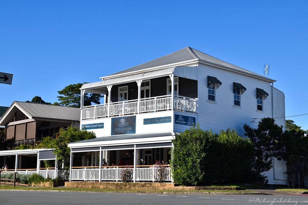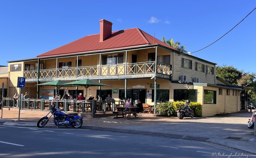 We return to camp to pick up Elle and Nic and take the scenic back road to Tumbulgum to have a look. Which I’m told is not pronounced as it is spelt or spelled. A short drive following the Rous River through cane fields and thickets of rainforest reveals attractive homes perched on the hillsides. Tumbulgum is situated at the junction of the Tweed and Rous Rivers. There are some classic examples of the style of homes of this area, attractive weatherboard homes on stilts. Tumbulgum Tavern (1887) is jumping with Sunday diners and people are picnicking on the lawns and fishing.