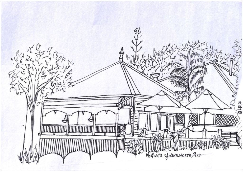 I’ve already selected a seat on the Main Street to sketch McGinn’s Cafe, so I grab my bag and wander over to the seat in the sun. Expecting a relaxing hour, instead, I find out how busy this little town is. Cars constantly park in front of the cafe and in front of me like musical chairs. Cars, they’re the bane of Urban Sketching. The sketch gets half done by the time I give up. A chap and his dog sit down on the seat and we chat. He’s homeless and currently camped in a tent in the Showgrounds. We’ve never seen so many homeless as there are at present. No doubt the result of Covid, floods, and the rental and financial crisis.
