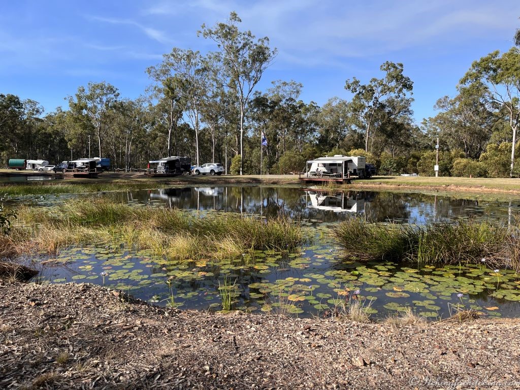 Then it’s on to the bush camp that we’ve booked online. The property features a number of deck sites overlooking two water lily filled dams and boasts a peaceful bush camp for over 50’s with self-contained RV’s. We meet the criteria, we’re all so well over 50, we can barely remember 50. We have RV’s and we are self-contained. Though like most caravanners and well-trained cats, we do prefer morning ablutions somewhere far away from where we eat breakfast. There’s a dump point near the gate, drop toilets in the scrub, and the manager informs us that we can park wherever we choose. The front part of the park is closely packed and higgledy-piggledy on unlevel black sand. It’s funny how your eyes quickly assess the levels in this caper. Woody’s mumbling “This isn’t a bush camp it’s a caravan park without flushing toilets”. We head past the deck sites which not only overlook the dams but also the sheds, that’s an added bonus for their $45. The second section is less crowded but still uneven. The hardest part is choosing a site, it’s always easier when a grumpy old sod says “You’re on site 30!” And you daren’t argue. We find a spot but thankfully before dropping our legs, the owner comes over to tell us that it’s on the runoff from higher ground and we wouldn’t want to be here when it rains. Great. After much pacing about and anguish over widow-makers and unlevel ground our delightful new neighbours suggest we share their patch of grass and we hook up to power and water. Upon reflection, we should have taken the level unpowered section at the back of the camp it may have been quieter.