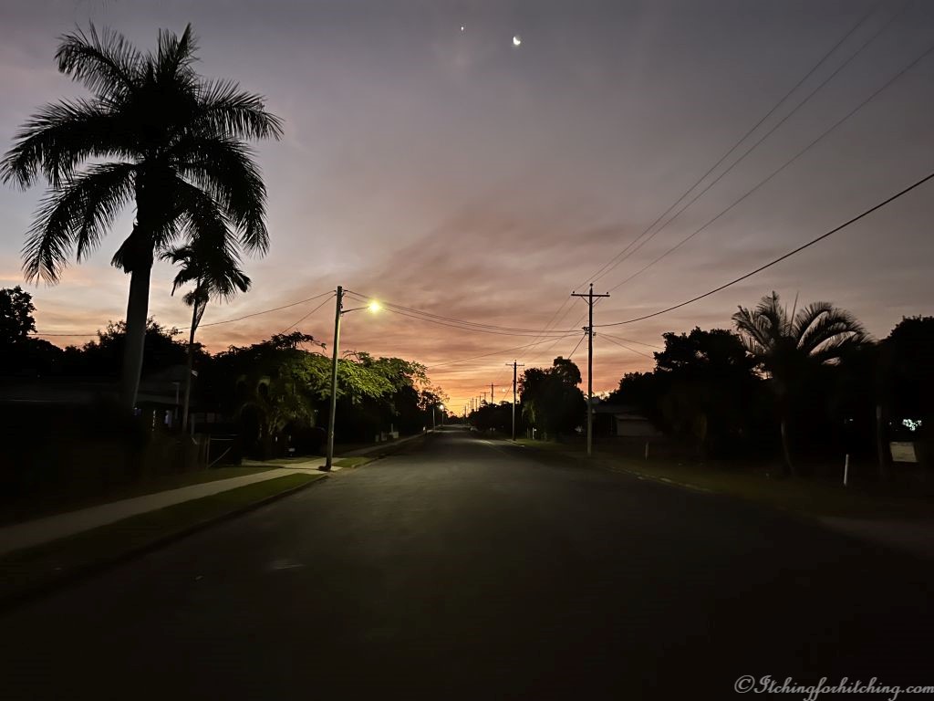 We’ve booked to have dinner at the local hotel and at 5:30 (we’re oldies remember) we stroll up to the gate to await the pub courtesy bus. At the first glimpse of the bus it’s ‘on your marks everyone’ for the courtesy bus stampede! We stand back and watch as folks push their way on as if the world is ending and we’re being evacuated. Five minutes later he’s back again and we board, the passengers are as noisy as a bunch of corellas on a hot afternoon. I can see we’re going to be in for a noisy evening because no doubt, most are deaf. As we pull up in the pub car park the sun is setting at the end of the street illuminating the row of power poles.