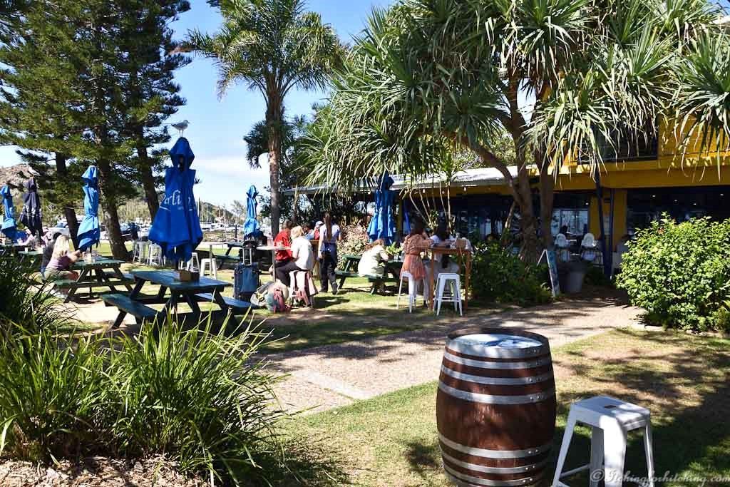 While Elle is undergoing repairs, we have lunch with Double or Nuthin’ and Shirley Temple and old mates who live locally C & W at Waterline restaurant overlooking the Marina. C & W are in the process of selling their farm and moving closer to the National Park and the family. They’re also doing repairs on a rental property and have paint splatters on their arms to prove it. C tells us that one of their daughters ‘must be a dingo’ as 4 of her 5 kids were born in the same month. When we look blankly, she explains that dingoes only come on heat once a year.