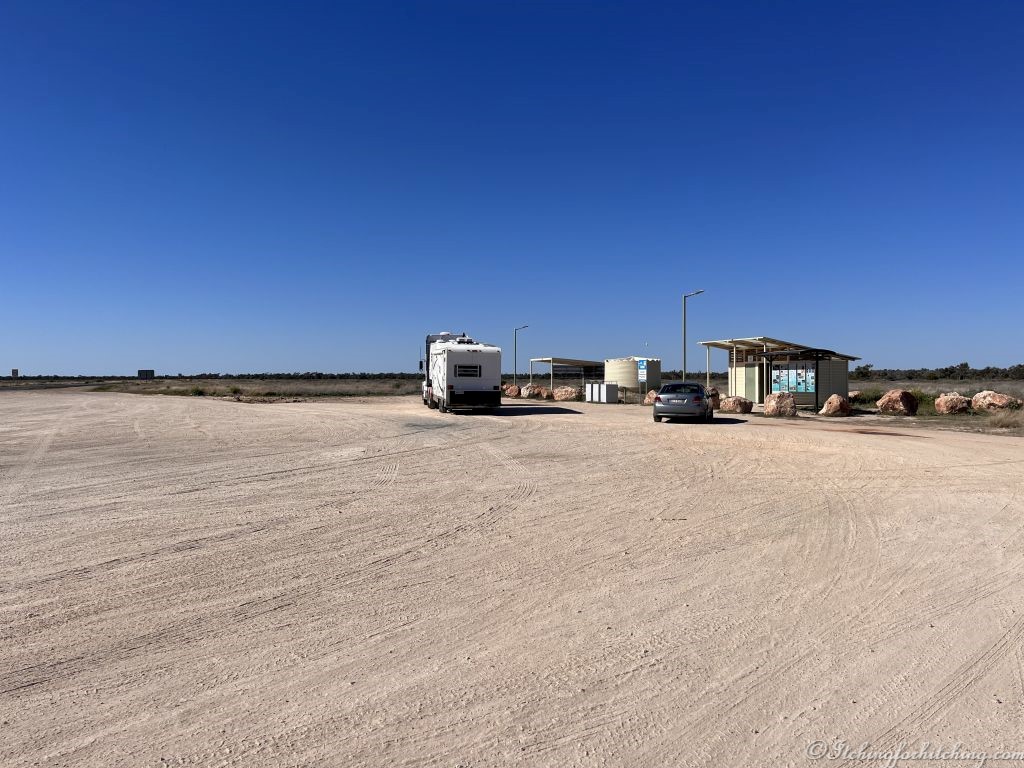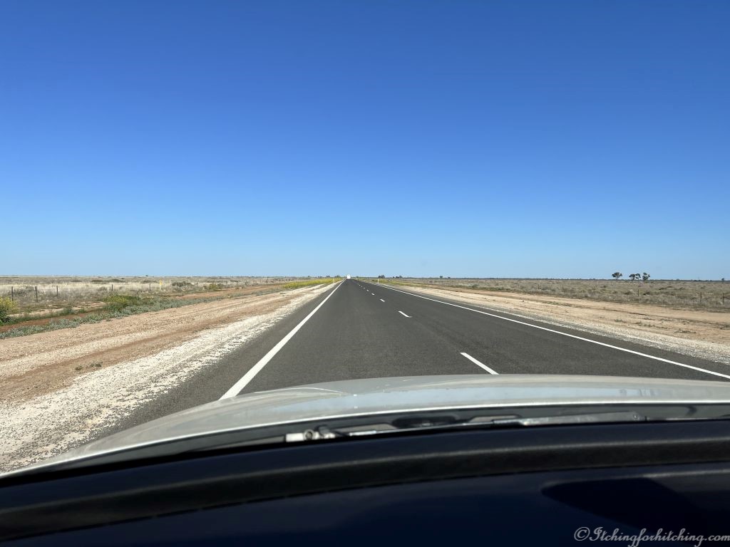 It’s flat country and dry to the horizon with mirages shimmering in the distance. We’re getting good fuel economy. The grass colour camouflages the kangaroos. The emus in their hundreds here look like walking shrubs and eye us curiously. The only evidence of homesteads out here are the letterboxes and creative signs declaring the station names.