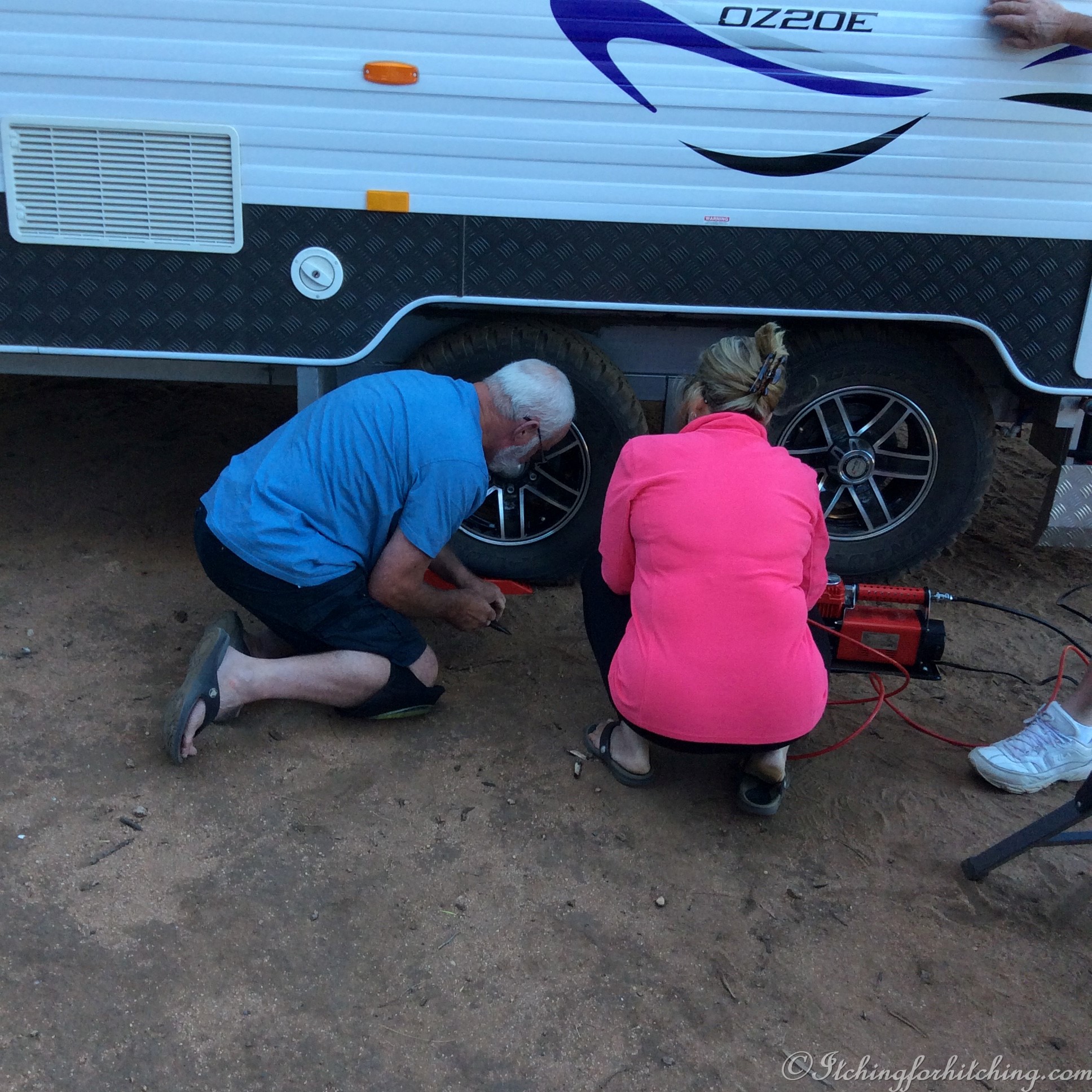 The important things, the things that keep us within the law, like the towing capacity of cars, caravan weights and whether you are talking overall weight or the ball weight. That one always gives us girls a giggle. Then there’s the tow hitch, the electric braking system, the choice of a dolly wheel or Trailer Mate jack, sway bars, hoses and sullage, black water, grey water, and the number and size of gas bottles. Not forgetting the batteries and types, now that lithium is becoming popular, especially for those relying on CPAP machines, and solar panels, be they fitted on the roof (don’t park under shady trees) or portable. Inside there’s diesel heating and the type of fridge, 3 way (gas, 12v, or 240v) or compressor fridge and of course one in the car for the beer. That’s just the start but enough to keep the blokes busy in, out, and under the van, before they even start talking about fuel economy.