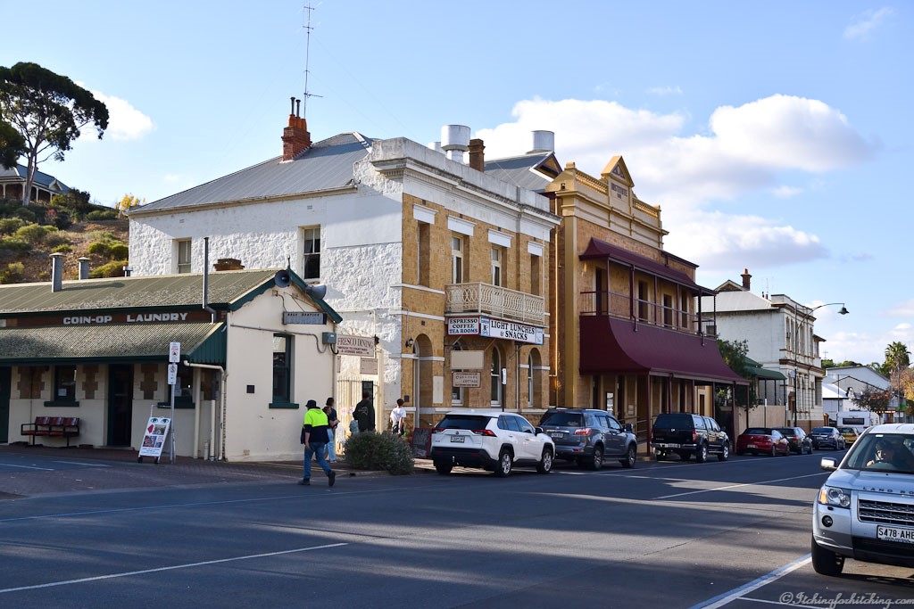 At Mannum we camp at the Haythorpe Reserve beside the river. There are two ferries operating here and the town itself is on the other side. Mannum is the largest town we’ve seen since Waikerie. The historic main street runs parallel to the river and several sets of steps rise steeply to houses perched on the cliff face high above flood levels. By this time, I’m swooning over the iconic limestone architecture and grand old buildings. The Hotel Pretoria (I’d love to know the history behind that name) has a deck overlooking the river and we watch a houseboat pull up to the pub wharf while we tackle a nice chilled white.
