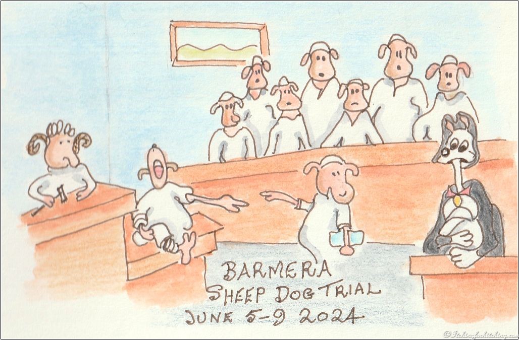 Waikerie is perched on the cliffs above the river. The locals must have a good laugh at the tourists trudging down the hill to the signposted toilets when in reality they’re up the hill. There are some nice old stone buildings and the eponymous Waikerie Bakery is still here. We wonder why the town is so quiet, until we notice the crowd at Saturday morning dog training. And speaking of dog training we happen to notice this billboard for the upcoming Sheep Dog Trials. I didn’t get a chance to photograph it so had to resort to sketching it. My apologies to the artist.