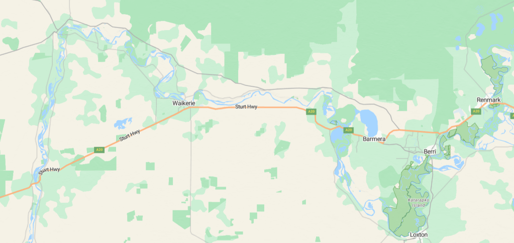 There’s a light mist over the river. After checking the air in the tyres, we head for Waikerie downstream and on the Old Sturt Highway. Once more we pass through small vineyards and glimpse Lake Bonney. This was where Donald Campbell attempted the World Water Speed Record in 1964 to achieve an Australian record of 216 miles per hour (348 Kmh). The vineyards seem to grow in size and the river and its many billabongs snake around in the distance. This is a fascinating area when viewed on the map.