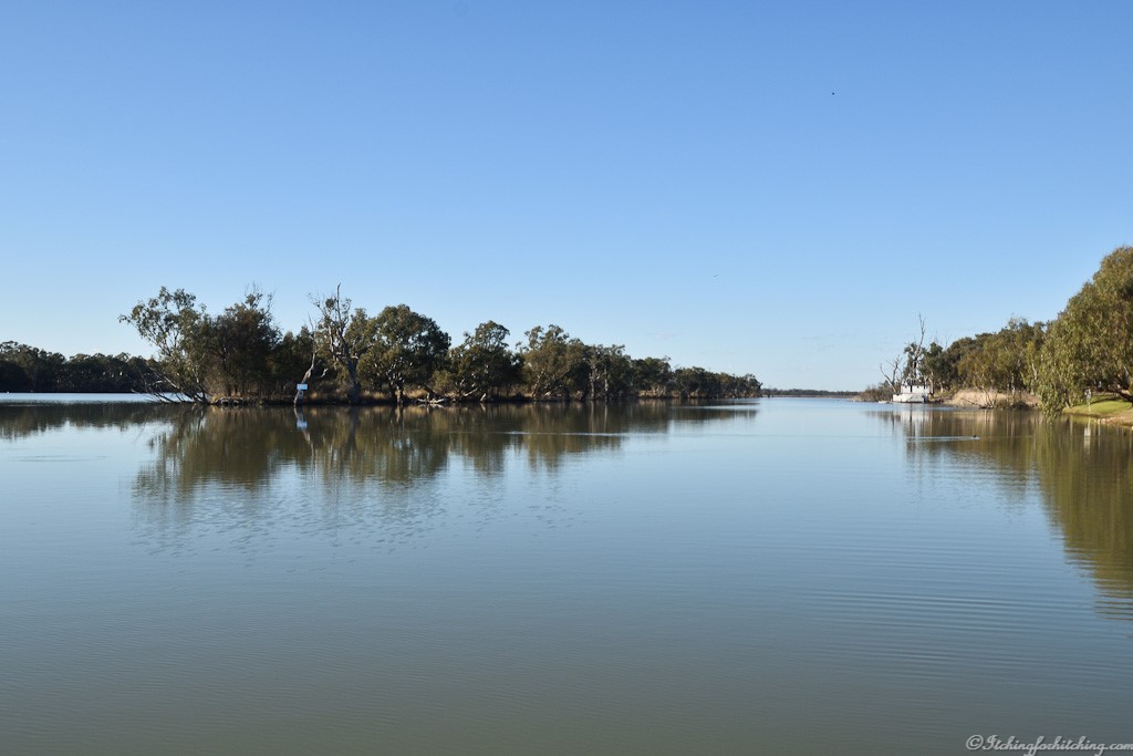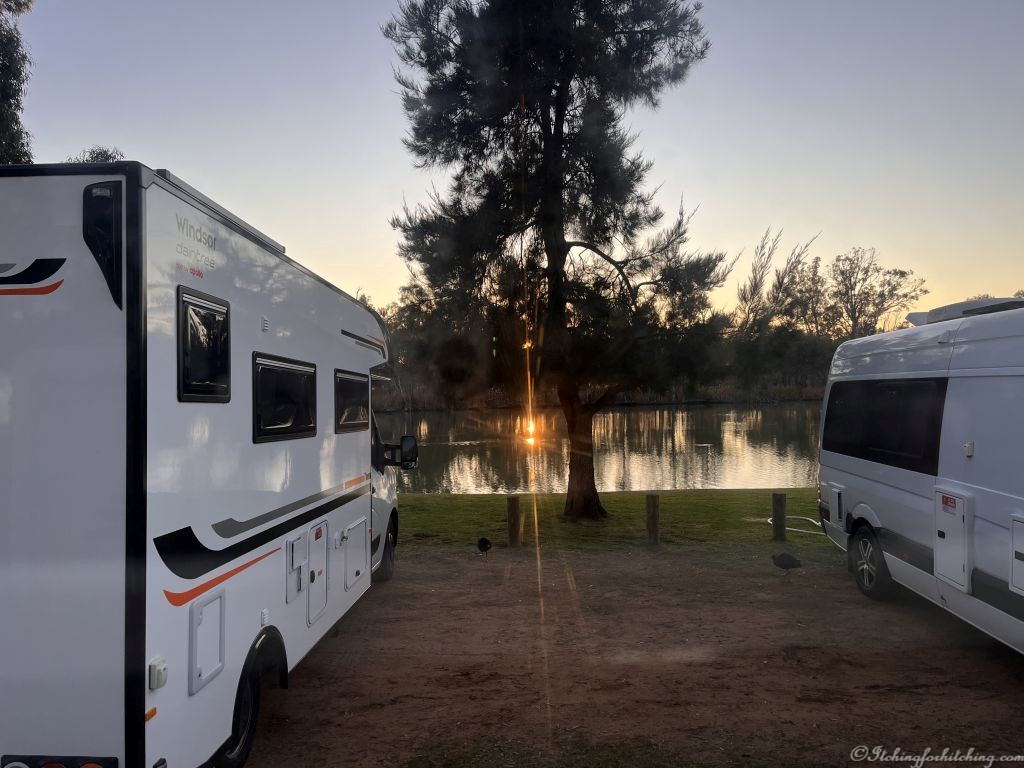 It wasn’t at all cold last night and we wake to a glorious morning with the rising sun peeking through the trees. The Murray is calm and the pelicans are swimming. Purple swamp hens peck about the lawns.