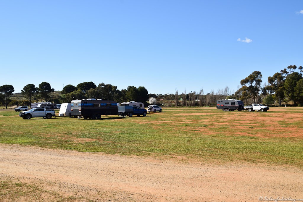 Peterborough is a railway town and there’s a huge train museum opposite the RV Park. We choose nice grassy sites and before I’ve even set foot in the caravan I’ve been bitten twice by large black ants, not on my feet and ankles but halfway up my calf under my jeans. On closer inspection, we’ve parked on top of an ant’s nest and they are not happy. We quickly move to an ant free gravelled area. Woody walks into town, Elle fights with her TV reception and I wash some of the dust off the floor. We have a relaxing happy hour until sundown when it cools. There are about 20 vans here but there is space for hundreds. It has no facilities as such, but it is a good and spacious overnighter.