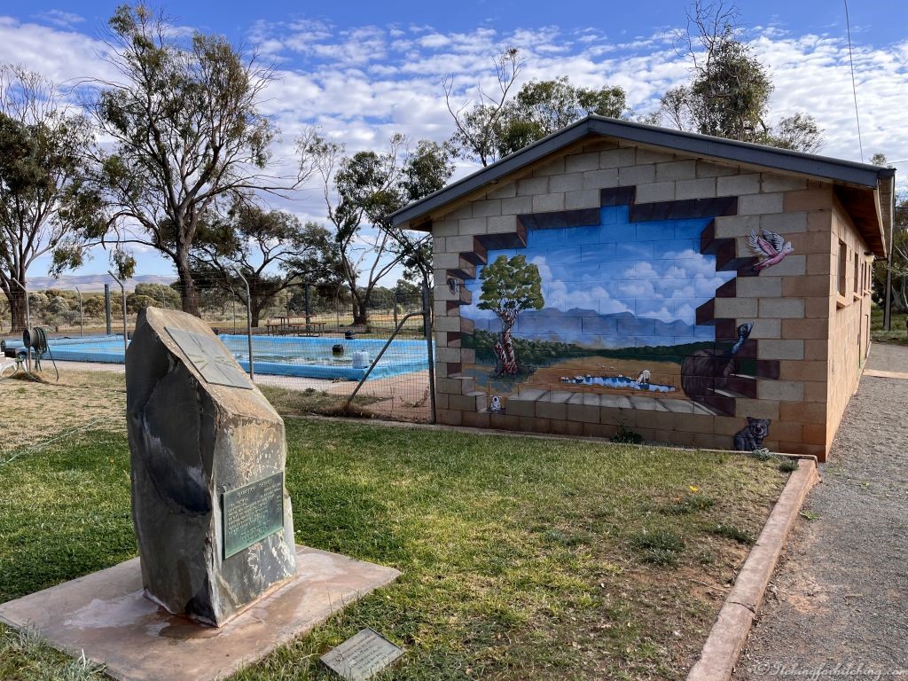 The upsweep of the Flinders Ranges comes into view as we meet VeeWee at the ghostlike town of Carrieton. She’s been here for a couple of nights and praises the caravan park. The pub is still operating, there are panoramic vistas of the surrounding hills. There are a collection buildings of uncertain status, of habitation that is. Splendid murals adorn both the toilets and the swimming pool building. Signs on the toilet doors request that they remain shut to keep the dust out. There is a lot of dust, red dust.