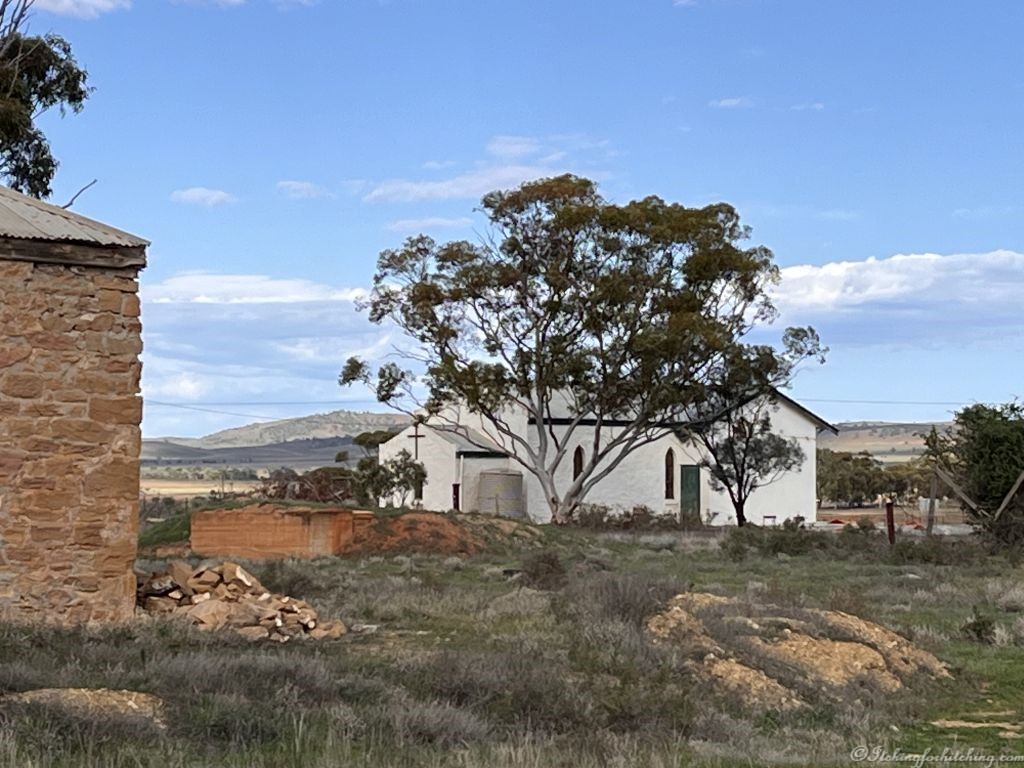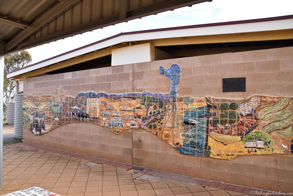 The upsweep of the Flinders Ranges comes into view as we meet VeeWee at the ghostlike town of Carrieton. She’s been here for a couple of nights and praises the caravan park. The pub is still operating, there are panoramic vistas of the surrounding hills. There are a collection buildings of uncertain status, of habitation that is. Splendid murals adorn both the toilets and the swimming pool building. Signs on the toilet doors request that they remain shut to keep the dust out. There is a lot of dust, red dust.