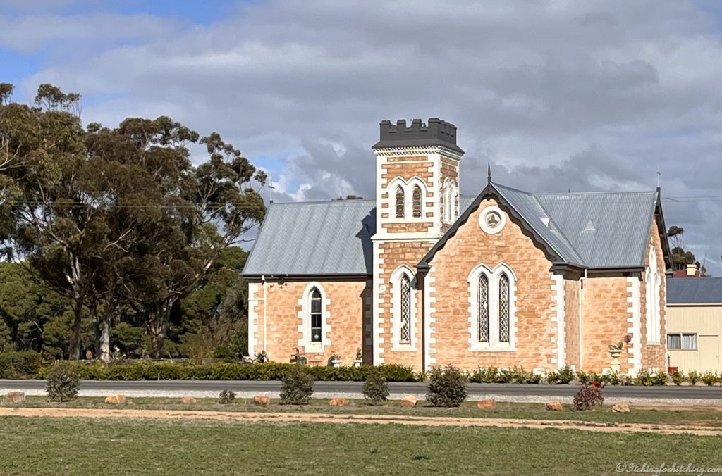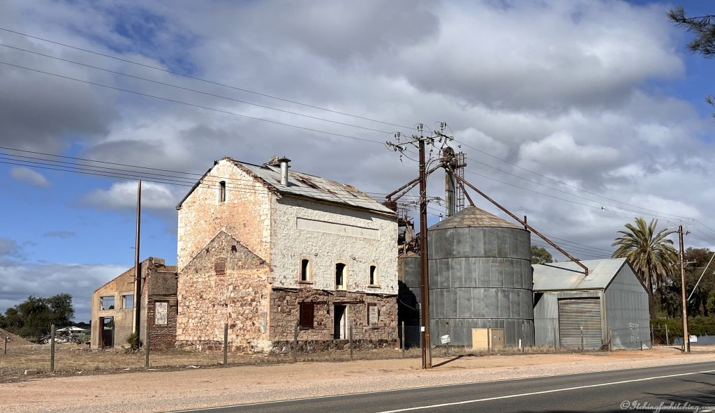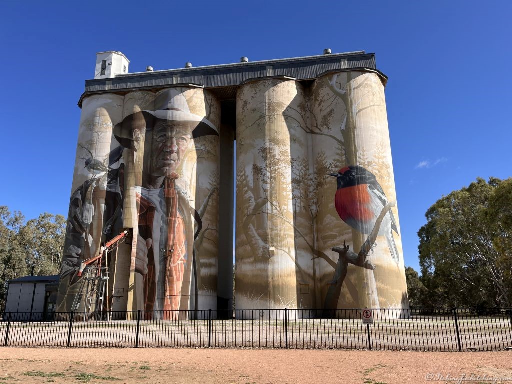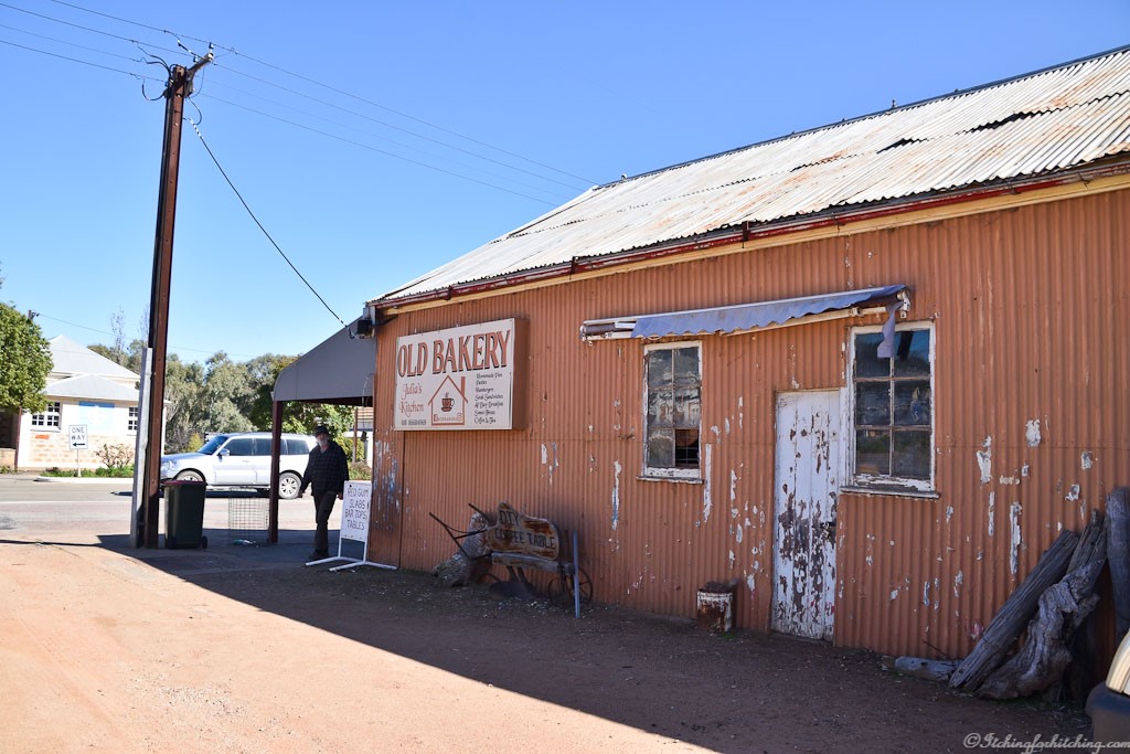 The Old Wirrabara Bakery though seduces us with its cheese and bacon bread and apricot scrolls. While Woody and Elle are in the bakery, I wish that I was a faster sketcher as an old farmer potters around, grey beard, flanno** shirt, a dusty old Toyota ute and a red Heeler as arthritic as himself. The silo art here has been painted by ‘Smug’ Sam Bates, the artist who did the birds in Dimboola and we stand there wondering for the umpteenth time at the talent of those silo artists. On we rumble, if only we’d bought a second loaf of that bread.