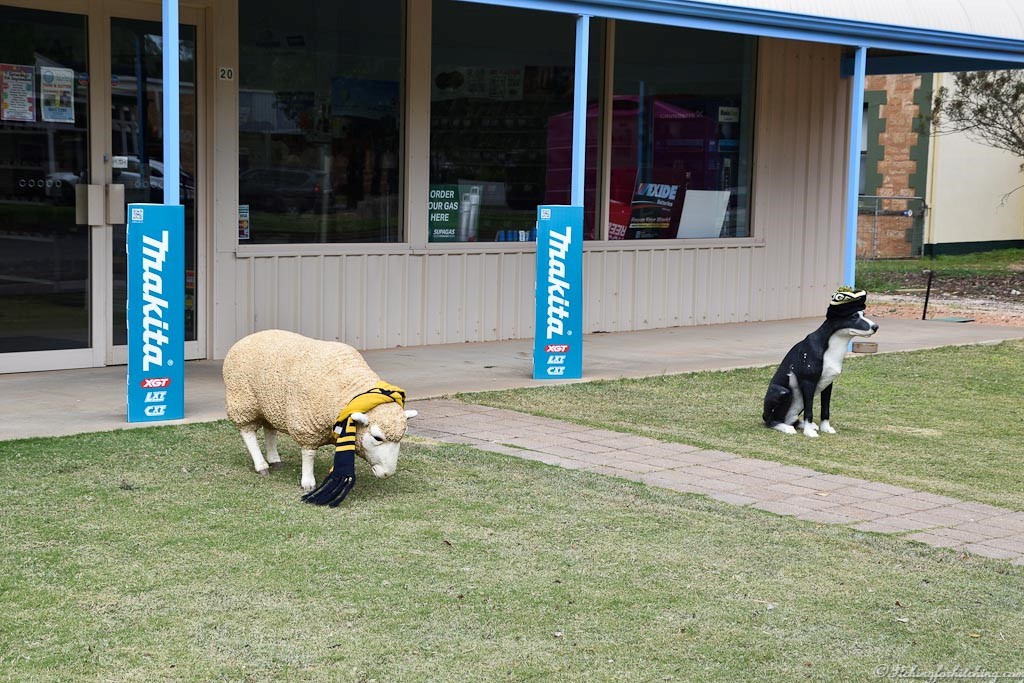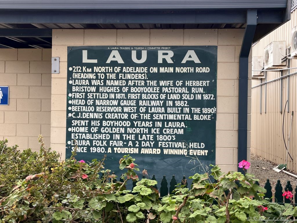 Laura is a welcoming town as the highway is flanked with an avenue of pepper trees and Kurrajongs. The Laura Community Caravan Park is a little beauty with a community garden that our grassy sites back on to. As we stroll around town the poodles Nic & Molly are perplexed by the plastic sheep and sheepdog outside the farm supplies shop. I guess they are quite realistic, but barking won’t move them. There’s one shop in the main street that has become a church and the sign in the window says, “Dunking biscuits and believing since 1875”.