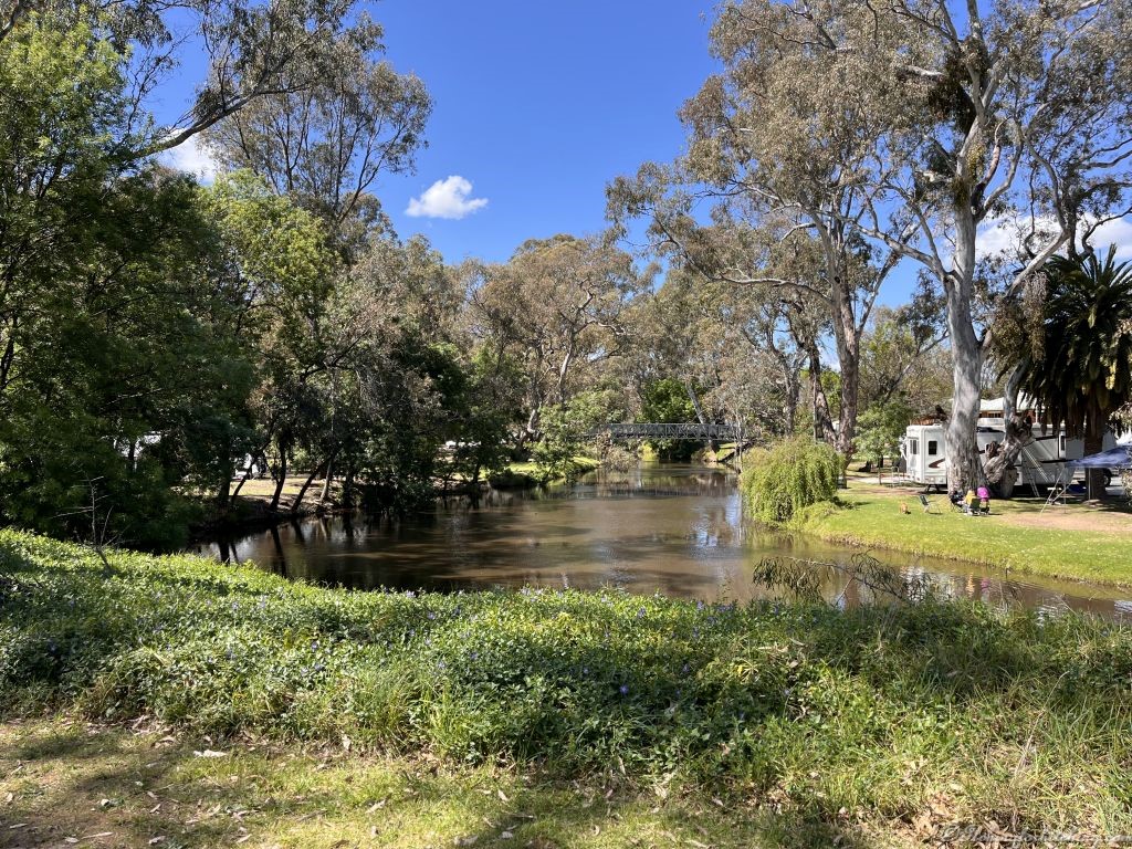 We’re surprised to find the town of Euroa heaving with cars and people for the National Show ‘n’ Shine car show and even more shocked to realise that some models that we’ve once owned are now considered ‘Classic and Historical”. What does that make us? Yeah, OK, bloody old. Cars aside, we stroll around town before we set ourselves up in the Euroa Caravan Park with views of Seven Creeks. With a name like that we’re not sure whether we’re looking at a creek or a river.