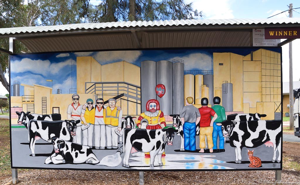 “Elizabeth Street beholds an eerie site. A complex of Sci-Fi proportions. Giant tanks and chrome pipes spread around pale yellow buildings. This place, once the hub of the town, now sits abandoned. Past workers with community members, ponder; along with unemployed cows, about their future.” https://www.rochestermuralfest.com.au/2020-murals
