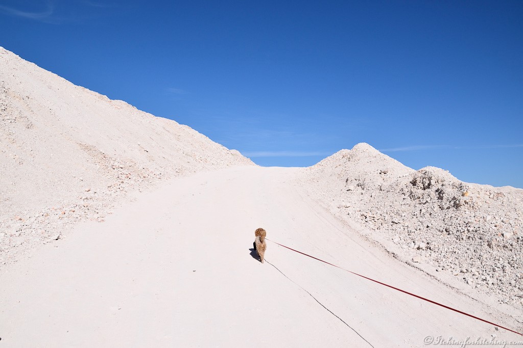 Next stop is Glengarry and a charming couple. He is a miner, and she runs a craft ‘cottage’. They’re from Canberra and spend the winter up here. I’m sure most Australians would say that they too would prefer living in a mullock heap to the Nation’s Capital any day. The Glengarry Hilton is a collection of sheds with a shipping container for a kitchen. This isn’t a building, just a collection of mismatched structures that have settled into several inches of talcum like white dust. It rises as you walk through it making you feel as though you are Neil Armstrong on the moon. The open air ‘dining’ area has a piece of carpet laid across the bare ground. Naturally it is permeated with dust. To be kind, the barmaid is a surly lass. The food though is plentiful and delicious. The smallest member of our group Tillie, is not allowed onto the ‘premises’ though we find out later that there are tight restrictions on dogs on the opal fields but I’m sure that applies to guard dogs not toy poodles. In any case Tillie probably would have suffocated in the thick white dust.