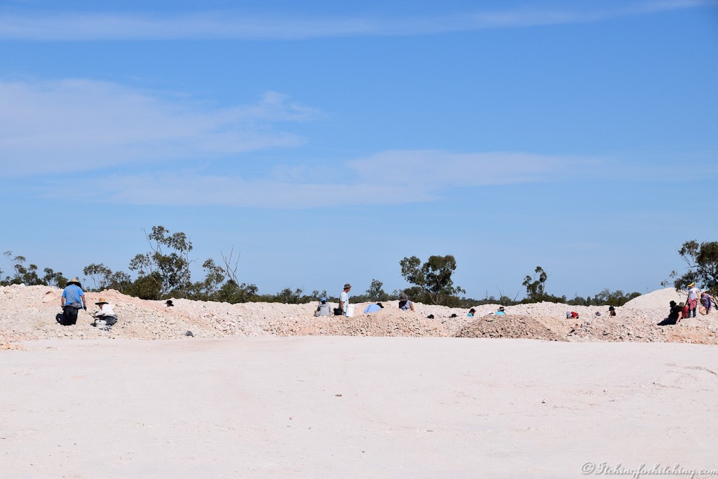 Bouncing off down the road we find the Noodling Dumps. Noodling Dumps? This is where the miners dump their unwanted rock and unlicensed prospectors like us can fossick for opal that the experts have missed. We later learn that this rock is cast off until they find a seam of potch usually forty or so feet down. Thus, we’d be pretty lucky to find anything! But trudge off up the mountain of blinding white clay and rock we go, and fossick about and find some pretty rocks and fossils. We’re easily pleased.
