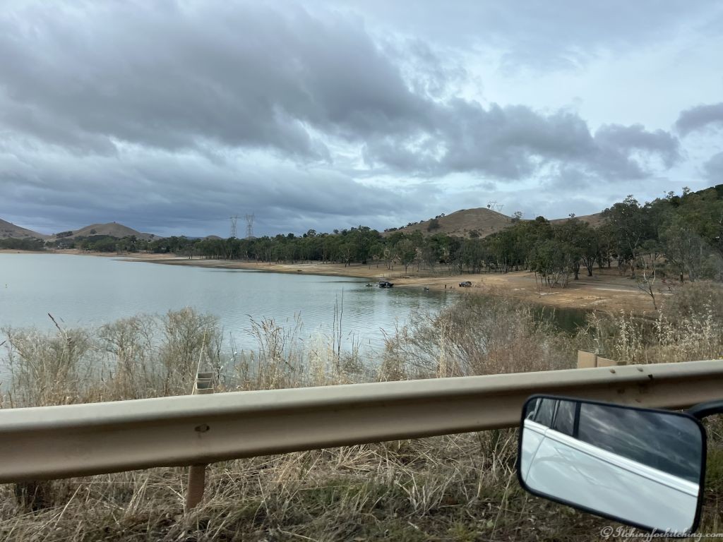 Our short break is over. We stop to change drivers at Yea, and I notice a piece of caravan gear on the side of the road…oh shit it’s our front window cover!