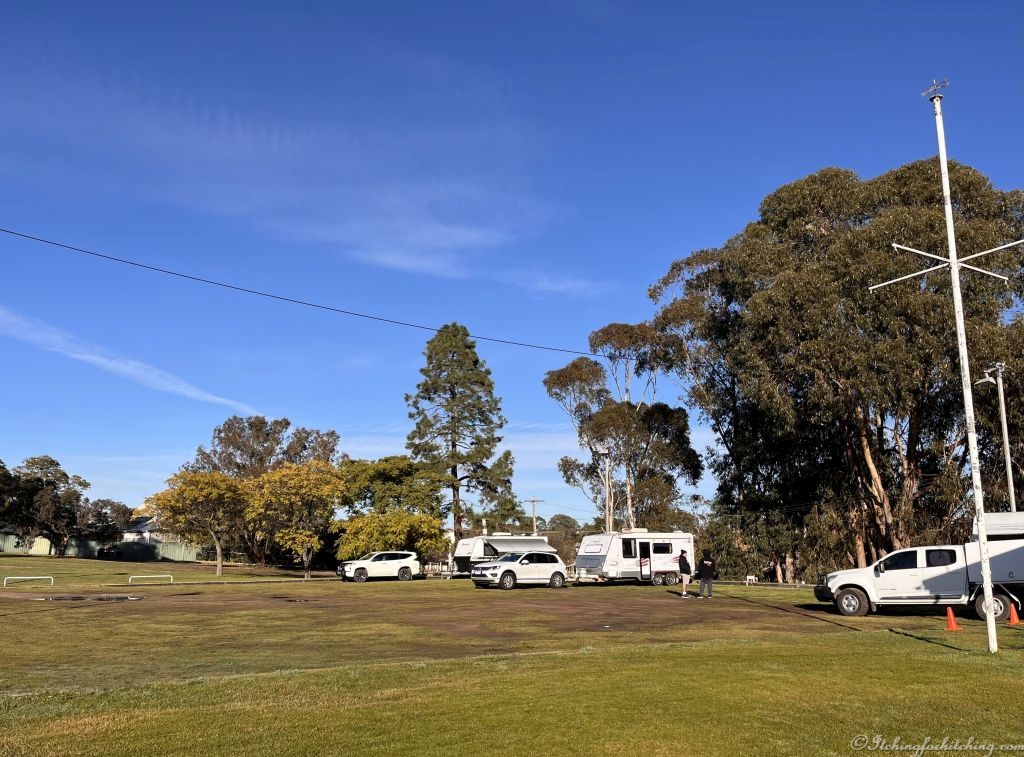By the time that we’re pulling out we can hear the arriving show roosters crowing in the poultry pavilion. I can tell you it’s an effort not to run over and say g’day to them. The Hume Highway is quiet, there’s spitting rain at times. The trees are still yellow and holding onto their leaves. We see thousands of solar panels, solar farms stretching for kilometres. Not far after Albury and the New South Wales border we leave the Hume Highway and pick up the Olympic Highway. Spotting an inviting bakery, we break for a warming coffee at Culcairn. It’s an old town with solid buildings, wide verandas and appears to have had much more importance in the past. This is the Riverina area that we’re in now so we’re talking grain and sheep, silos and a main railway