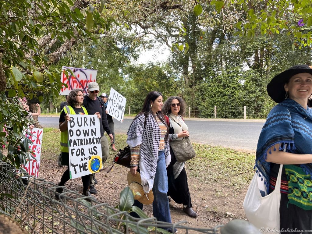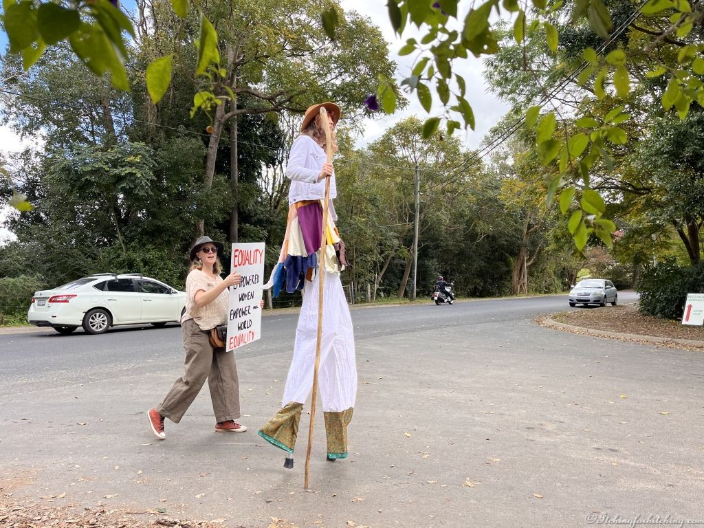We’re having a two night stay here so it’s a good chance to have a bit of a sleep in. Woody walks across the bridge into town to buy some fresh baked bread and croissants from the laneway for breakfast. It’s a delightful morning and the music festival is starting to set up. Before lunch we take a walk and when I get to the corner (after photographing a few plants, any wonder Woody won’t walk with me) I’m stopped by a parade of bongo playing hippie attired protesters ambling past. I feel like I’ve just been transported back to the 60’s. It seems that they’re protesting about everything: ‘No Means No’, ‘Feminism’, ‘Gender Equality’, ‘Indigenous Equality’, and against Patriarchy, Fishing and The System as in ‘Fxxx the System’. Now if they mean my gastric system, don’t bother it already is. The bloke standing next to me says “It looks like they’ve pretty well got it all covered”.