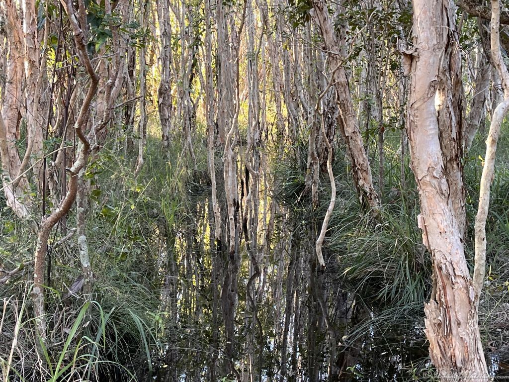 The weather improves a little after lunch so Woody heads off to the beach, while I take a walk around the riverside streets in this part of town. Whilst I’m leaning on a tree sketching the oyster barges, a tan-coloured kestrel flies overhead and returns with a fish in its claws. Of course, the camera was in the caravan. There’s still quite a bit of water about from the recent storm, and the Paperbarks are reflected in the water.