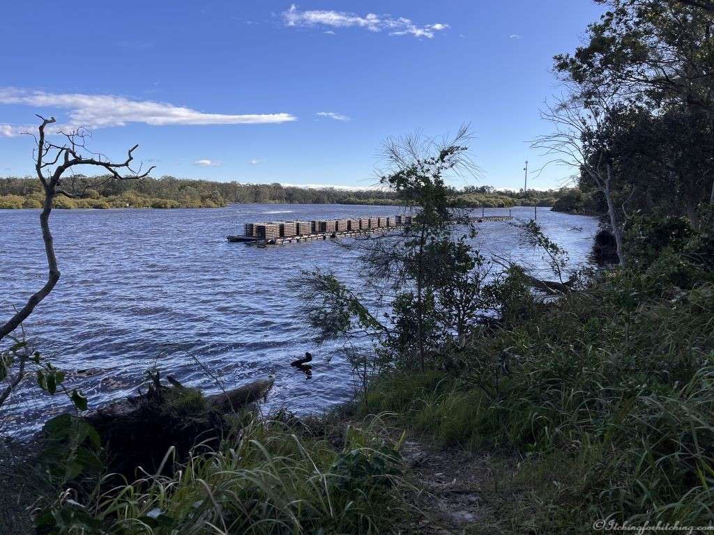 The weather improves a little after lunch so Woody heads off to the beach, while I take a walk around the riverside streets in this part of town. Whilst I’m leaning on a tree sketching the oyster barges, a tan-coloured kestrel flies overhead and returns with a fish in its claws. Of course, the camera was in the caravan. There’s still quite a bit of water about from the recent storm, and the Paperbarks are reflected in the water.