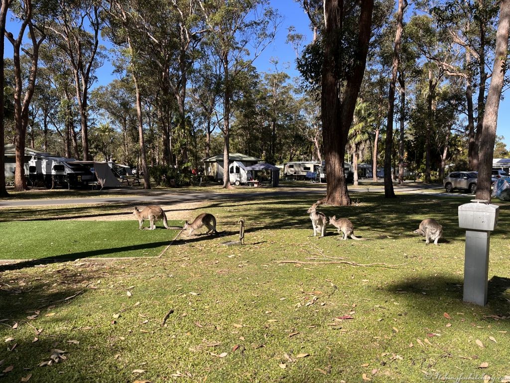 Less than an hour later, we’re checking in to the NRMA Darlington Beach Resort near Woolgoolga. We had forgotten how pretty this park is, from the lily lagoon at the front entrance to the hibiscus flowers. From the large sites to the mobs of kangaroos snoozing on the lawns.