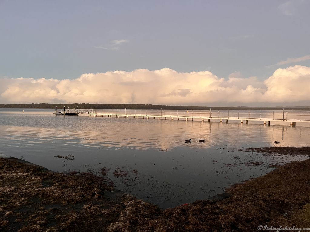 This time it’s the Ingenia Holidays at Lake Macquarie at Mannering Park. We’re given a less wet site, but the tap is leaking and unusable. We’re too tired to complain but a maintenance guy helps us lift our van legs out of the mud. This area has copped a deluge of around 200mm from the recent cold snap and down on the lake shore there is evidence of flooding. The park is well situated on the lake and there are birds everywhere. We just need to remember not to look to the south at the concrete chimneys of the power station.