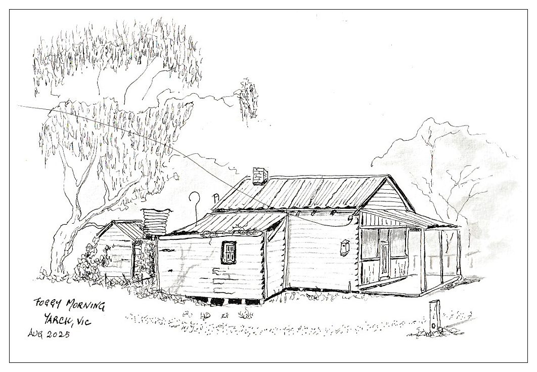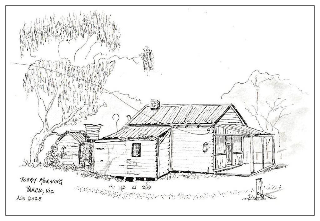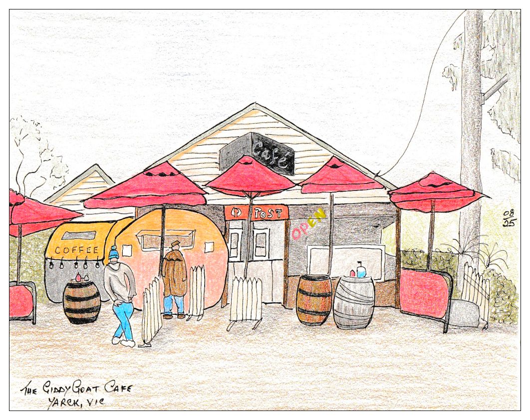 At the tiny town of Yarck we stop for a coffee at The Giddy Goat café which we learn, and must remember, is only open on weekdays. It’s a great little outdoor café and today in the cold and mist they’re doing a roaring coffee trade. Stamping our feet to keep warm I snap photos for later sketches and Woody orders our brew. I can’t help but notice a farmer waiting at the counter looking rugged up and dry as a chip in his DrizaBone coat.