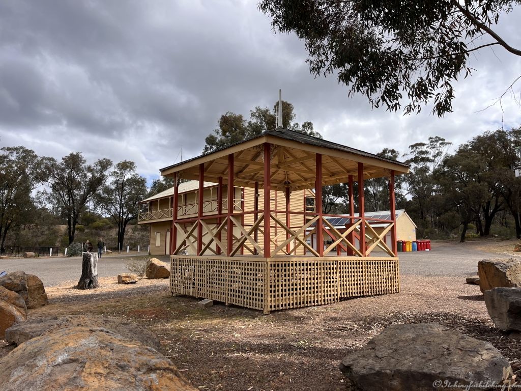 Tarnagulla could almost be called a ghost town. This once thriving gold town of canvas tents was then known as Sandy Creek and my great grandparents met here in 1861 and married in Dunolly. A couple of streets back from the main street is the historic reserve. Surrounded by the typical dry and hungry goldfields bushland, there’s an oval, and a restored cricket pavilion and bandstand. Camping is available and it is a popular spot for prospectors searching for alluvial gold. We find ourselves a spacious area with room for 3 vans.