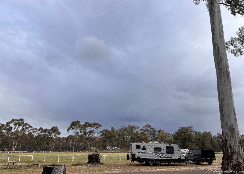 There’s a caretaker on site and he has a chook run housing a flock of friendly brown chookies. One of the campers has a donkey and Shetland ponies that pull a trap. You never know what you’ll find in these places. Silicon and Crafty M arrive and we do a fair bit of yacking before a storm drives us indoors. Thankfully it only yields a few plops and within minutes we’re back outside in the sultry air catching up on the gossip.