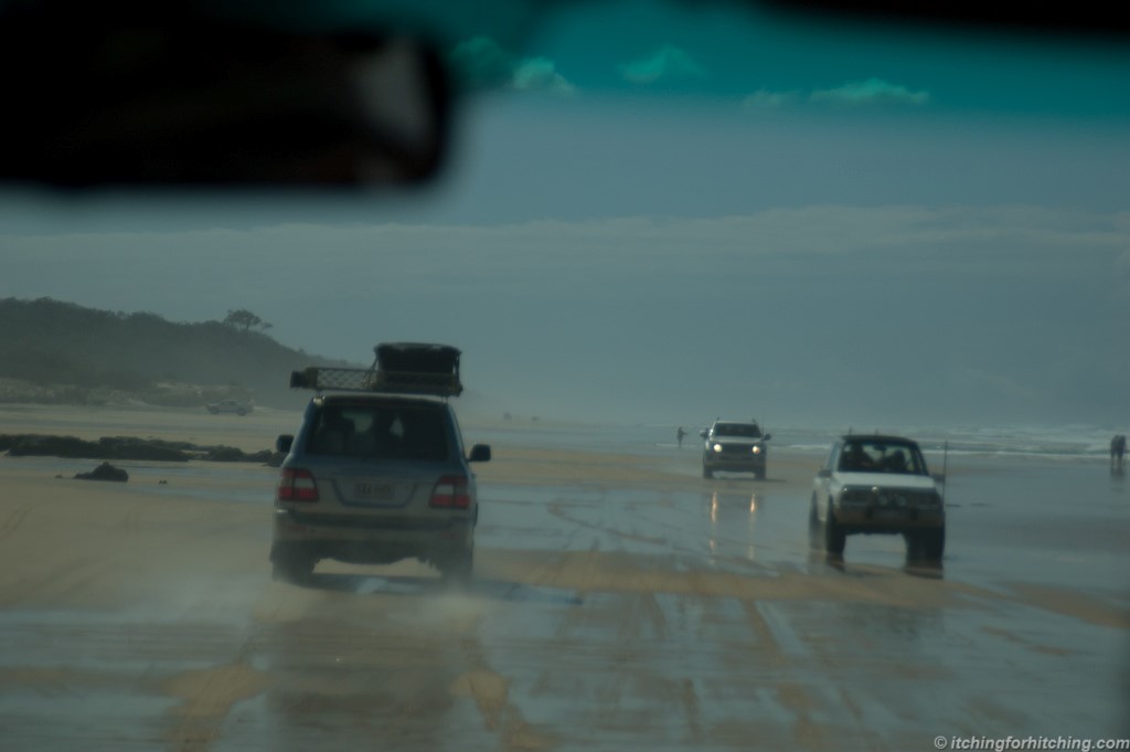 We cross the island and arrive at the little township of Eurong where there is a reasonable sort of resort and from what we can see as we fly past a few basic shops. Here we drive onto the beach, 75 Mile Beach, which stretches off into the sea spray haze. As Franz stops on the sand, he warns us to watch out for traffic and planes, but because his knowledgeable commentary has become something of a monotonous drone, like airplane safety routines, we all completely disregard it. We clamber out onto the wide hard sand and run for the surf when all at once we realize that we are running blindly across a major highway and there are hoons tearing down the beach at a minimum 80kph! The beach speed limit is 80kph so of course that is considered to be the starting point. Four-wheel drives are adorned with surf fishing rods and tall flags and seem to be driven by the intellectually challenged. The long beach could be beautiful if not for this madness. We soon discover that the beach is also a makeshift airstrip and yes there are planes taking off and landing beside us as we drive! Heaven knows what the salt does to the landing gear. We clamber back in and lay some more sand on the floor and head north along the beach at breakneck speed, although it is much smoother now, except of course when we bounce across creek outfalls or over rocks. Franz tells us that they aren’t really rocks because they’re formed from sand, yeah, right Franz, they’re still hard.