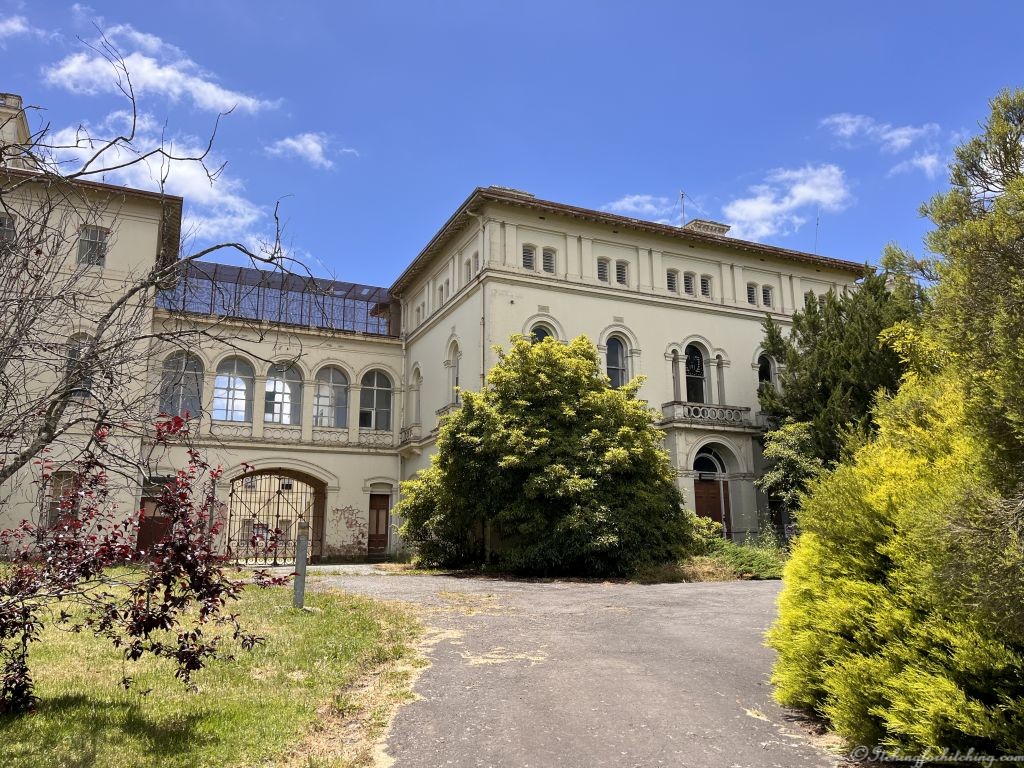 To pique our curiosity, we return to Aradale Lunatic Asylum (Aradale Mental Hospital) once more. Aradale operated as a psychiatric hospital from 1865 until 1998. This time we hoof it through the shrubbery. The property is massive, the first building we come across is more recent with a mid-century look to it. There are office structures, buildings and sheds all from different decades, and buildings with rusting wire mesh walkways.