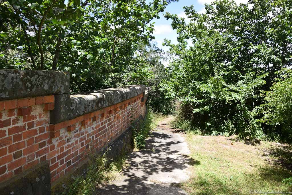 The main building is set on the crown of a hill overlooking orchards and vineyards towards Green Hill Lake. Thankfully the grass has be mown though the plants give the place the feel of a haunted house of horrors. We follow a bluestone capped brick wall down the hill, make our way through shrubbery and follow an old stairway until 3 storeys loom above us, 2 gated archways, and more rusted wire mesh walkways connect the 2 crenelated towers. A decrepit driveway encircles an empty pond. This is the stuff of nightmares, and I try not to dwell on the lives of those who were driven up this driveway and dropped off at the front gate never to be seen again.