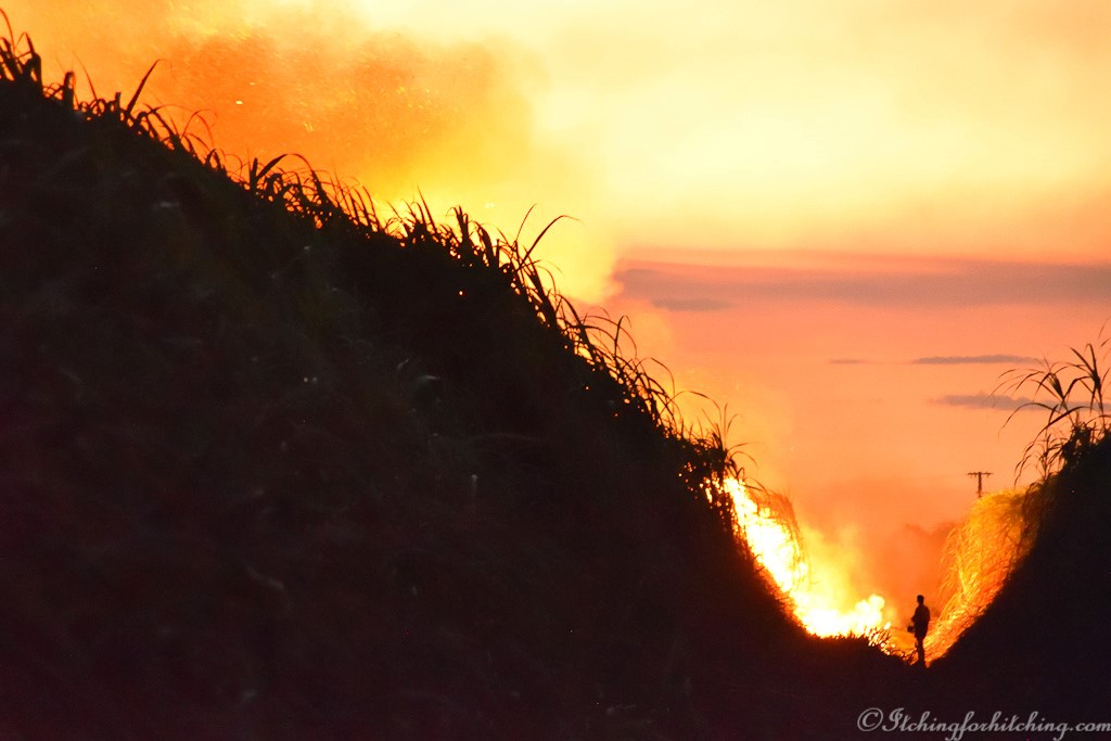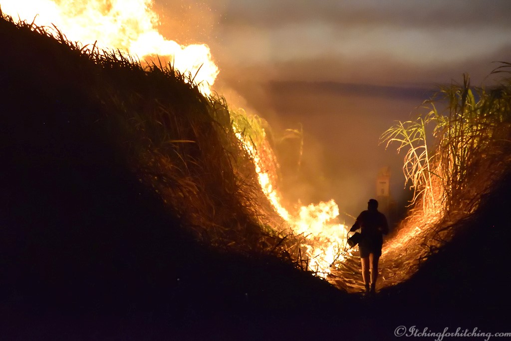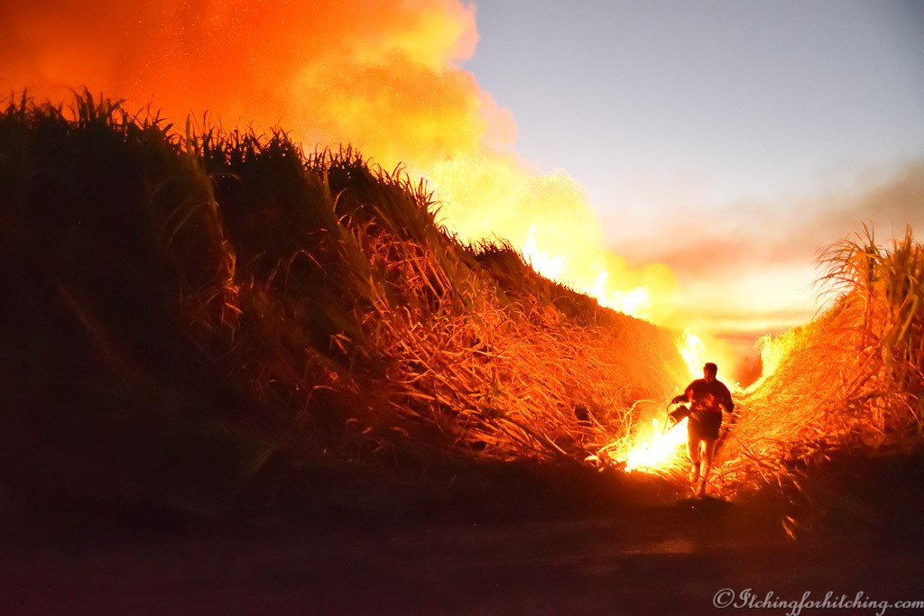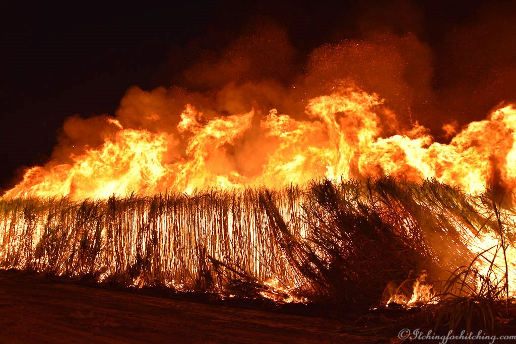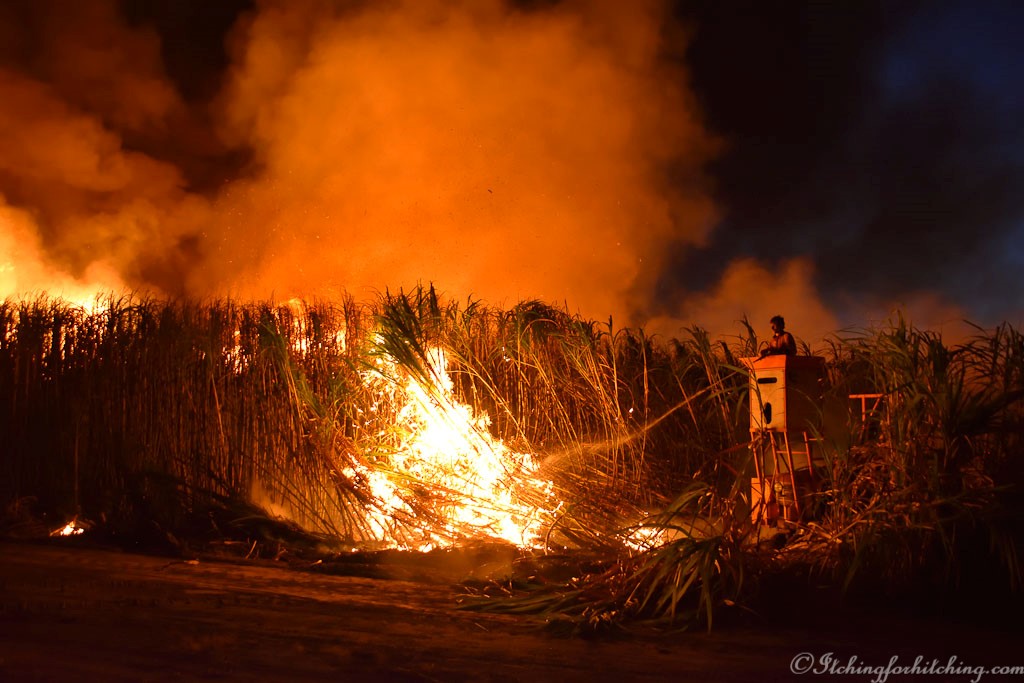 Then someone shouts and, in the distance, we can see the glow of a fire about a kilometre away. As we watch we can see a farmer lighting the cane, a black silhouette against the flames slowly walking our way. It is tradition that the owner of the cane does the lighting. On one side of us we can hear the evening cacophony of crickets and frogs in the tall, green growing cane, on the other side the fire crackles towards us. Then it’s bursting and exploding with tremendous heat right in front of us followed by an extinguisher truck. Within minutes it’s all over just the dried cane trash (dead leaves) has been burnt and we are left speechless. We climb in the vehicles and go back to the farm where Greg joins us at the fire pit while our chops sizzle.
