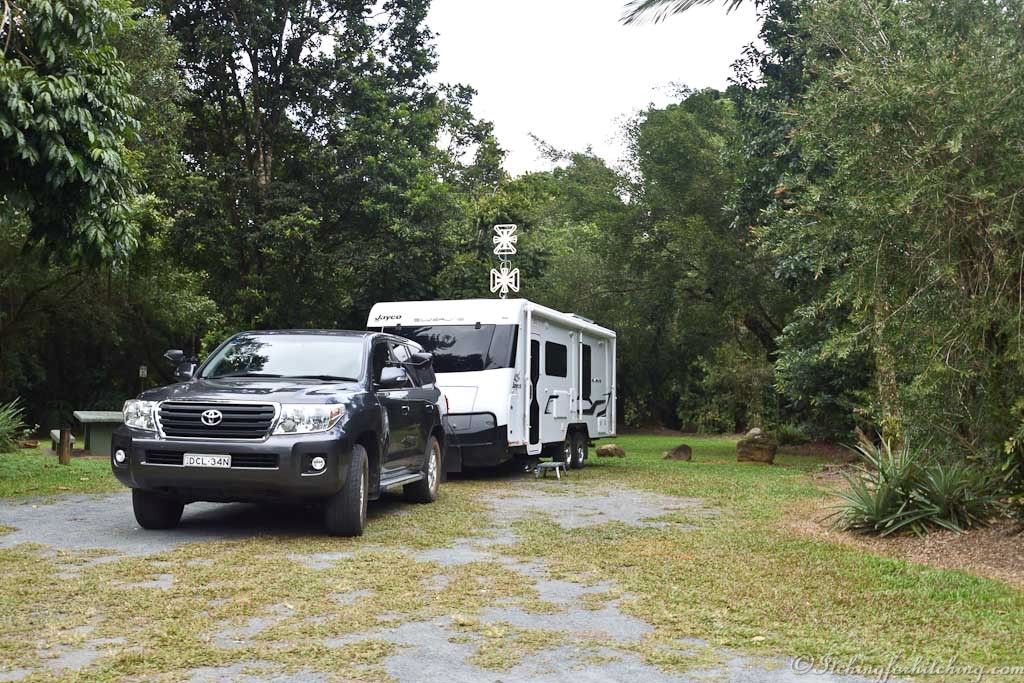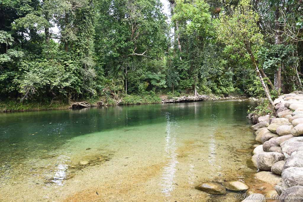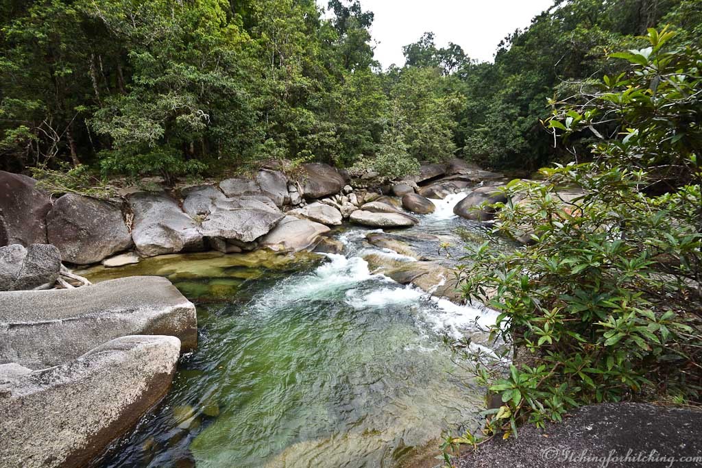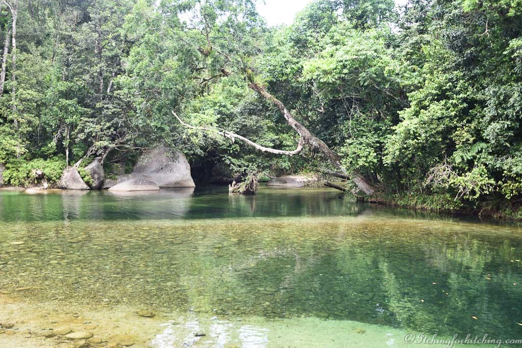 Never having heard of them and out of curiosity we follow the signs to the Babinda Boulders. There is a campground in the rain forest and a crystal-clear swimming hole in a wide bend of the river. It’s a perfect place to spend a hot day. A half kilometre walk through the rain forest reveals the Boulders Gorge.