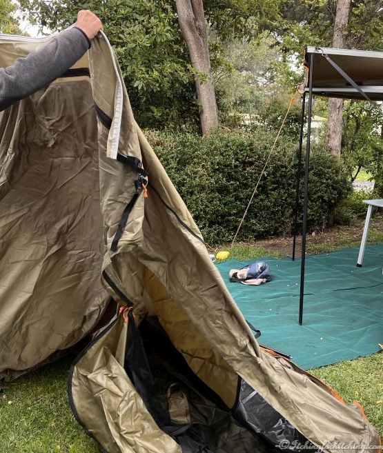 While Woody walks, Toothless helps VeeWee erect the side awnings on her teardrop camper. The Angels arrive and we share a BBQ in the cosy outdoor camp kitchen.