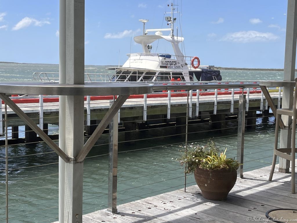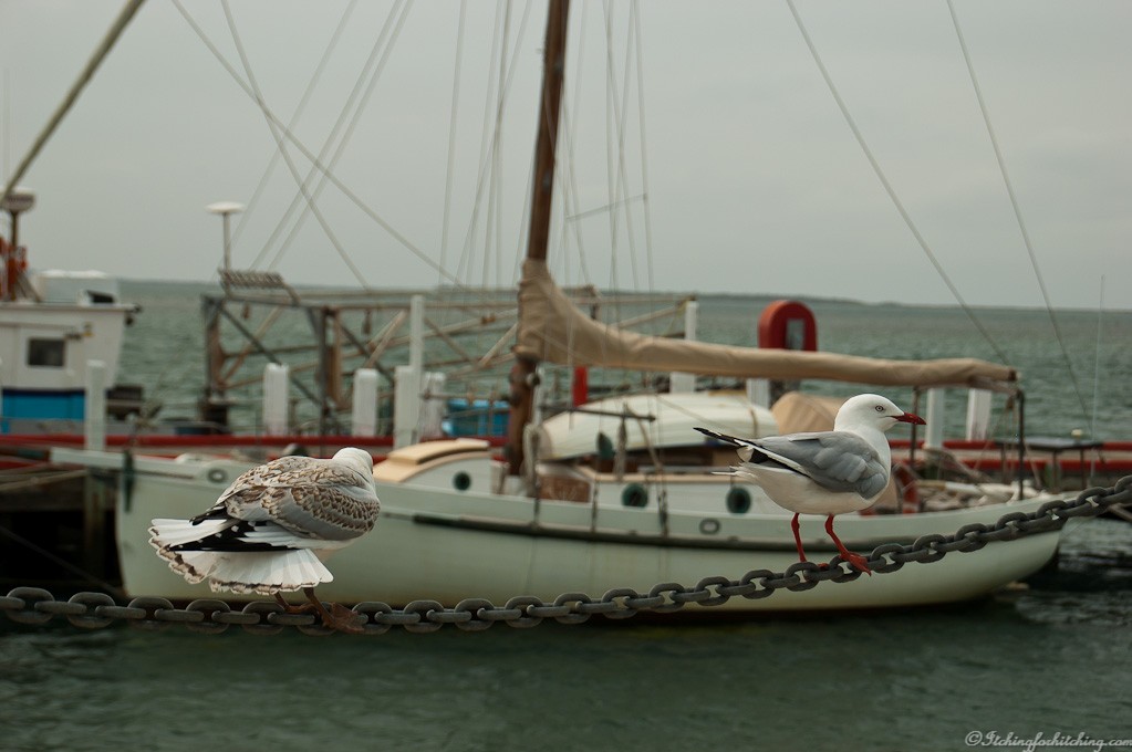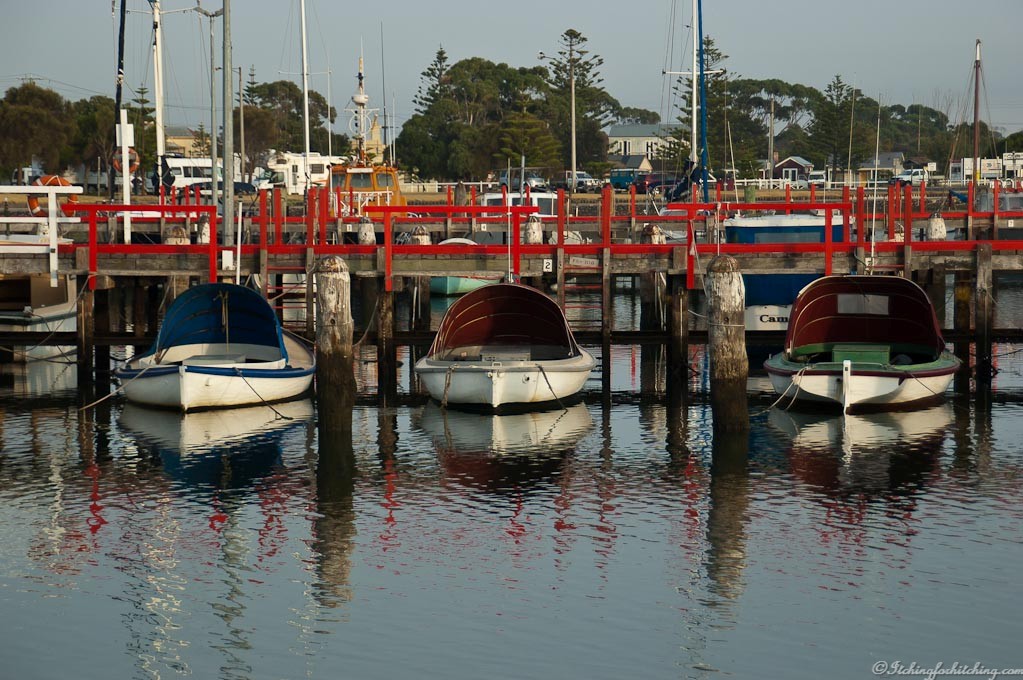 Returning via Tarraville and Port Albert we’re lured into Port Albert Fish & Chip Co, the famously good fish and chip café at the end of the Port Albert wharf. The wind outside is blowing a fierce westerly and even the seagulls are hunkered down against it and probably tired from flying backwards. The lunch is delicious. Big pieces of perfectly cooked and juicy flake (shark) and flattie tails (flathead is a local specialty). From the window we have a view of fishing boats, the low tide and shallow water on the inlet, and the distant islands.